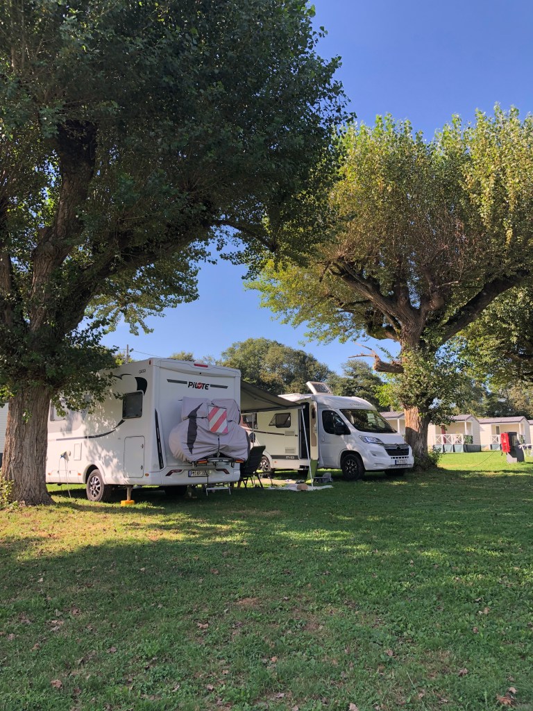 Weiter ging unsere Reise über Nimes und St. Gilles, kurz vor dem französischen Mittelmeer. Wir besuchten ein Amphitheater und wurden Zeugen des aufregenden Festes „Saint-Gilles-du-Gard“. Bei dem dreitägigen Event werden neben der Prozession zur Pfirsich- und Aprikosenernte auch Bullen mit Camargue-Pferden durch die schmalen Gassen gejagt und Stierkämpfe in der Arena ausgetragen. Langsam machten wir uns auf den Weg Richtung Pyrenäen, da auch Steffens Eltern sich nun auf den Weg Richtung Westfrankreich gemacht hatten, um einige Tage mit uns zu verbringen. Wir hielten in Carcassone an, besuchten die große Burg und parkten dann mit Steffens Eltern in dem berühmten Pilgerort Lourdes. Natürlich berührte Baby D. den heiligen Felsen in der Grotte von Massabielle, wo im Jahr 1958 die hl. Bernadette die Muttergottes gesehen haben soll. Und wir freuten uns doch, die Pyrenäen wieder zu sehen. Spätestens beim Eintreffen im nächsten Ort sollten wir uns wieder heimisch fühlen.