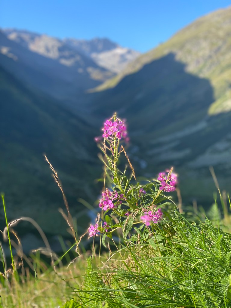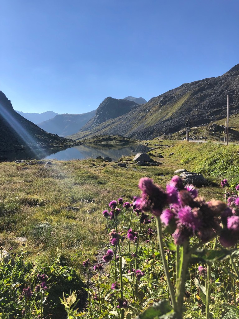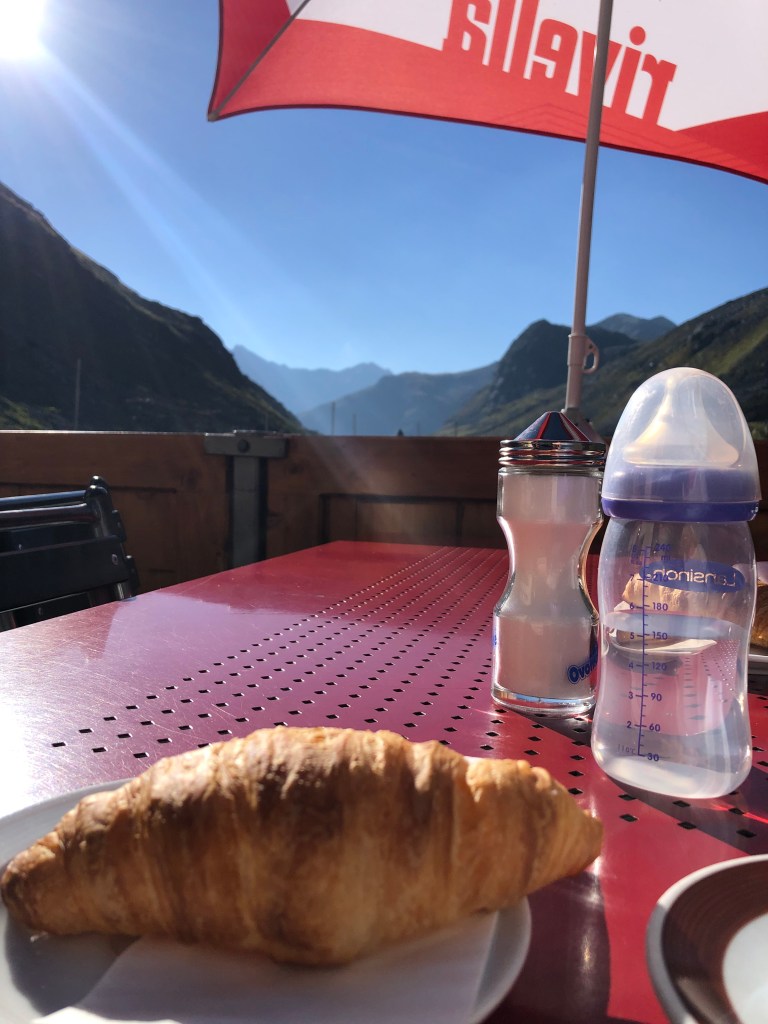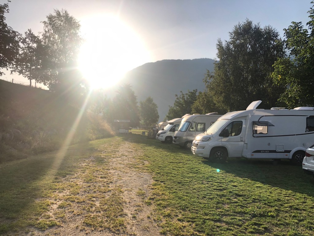 Am nächsten Tag fuhren wir ausgeschlafen (jedoch nach viel Hin und Her) über den 2383m hohen Flüelapass. Hin und Her, weil wir nicht sicher waren, wie gut er für unser Auto ausgebaut ist. Einige Pässe sind ja auf dem Höhepunkt nicht mehr gut asphaltiert oder sogar nur aus Schotter. Die Gedanken waren aber völlig umsonst. Der Pass lässt sich in den frühen Morgenstunden wunderbar befahren und auf dem Höhepunkt haben wir das Restaurant um 8 Uhr mit aufgeschlossen, die Sonne genossen und über die unendliche Stille gestaunt. Wir fuhren dann etwas abseits bekannter Städte und Routen weiter und stellten unterwegs fest, dass es hier echt wenig Campingmöglichkeiten gab. Das sorgte für große Anspannung bei allen. Mit viel Verspätung landeten wir dann auf einem privaten Stellplatz zwischen riesigen Bergen im Tal in Sumvitg. Verspätung in Verbindung mit Anspannung heißt in unserem Reisemodus mit Baby, dass das zweite Schläfchen vorbei, das Kind hungrig ist und einen großen Entdecker- und Bewegungsdrang hat. Dieser muss in kürzester Zeit ausgelebt werden, weil um 19 Uhr wieder Schlafenszeit ist. Und bis dahin muss alles stehen, niet- und nagelfest sein, damit nach dem Einschlafen des Würmchens Ruhe herrscht und nichts mehr vorzubereiten ist. Ja, wer hätte das gedacht… wir vor wenigen Tagen auch nicht. Zum Glück hatten wir aber alles dabei, was wir brauchten. Ausgerechnet an diesen Orten entstehen dann immer die schönsten Gespräche mit anderen Cammpern.