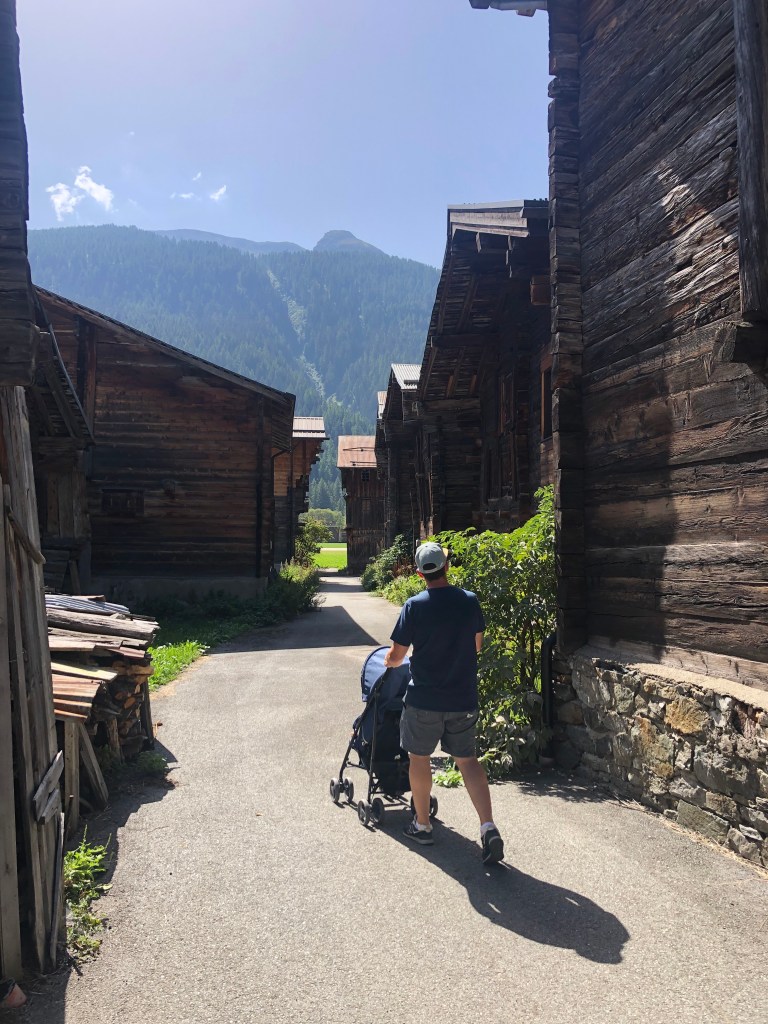 Mit dem Ziel des Mont-Blanc wagten wir auch die Überquerung des Oberalppass mit 2046 m. Wir besuchten die Rheinquellen und genossen das rege Treiben am See. Danach fuhren wir an den Ticketschalter des Autoverlads Realp-Furka und wunderten uns über die leichte Einfahrt. Ticket ziehen, einsteigen. 20 Minuten lang ratterten wir durch den Tunnel unter den hohen Bergen, Baby D. vorne auf dem Schoß sitzend. Kurz danach erreichten wir Ulrichen – ein Ort, der für seine alten Holzhäuser, die vielen Passstraßen und Wanderwege und als Tor zum Süden bekannt ist. Hier trafen wir ein sehr gesprächiges holländisches Pärchen, das viel zu erzählen hatte, aber auch über das Elternzeitmodell in Deutschland nicht schlecht staunte. Recht hatten sie: Ein Baby zu bekommen und genug Einkommen trotz Babyzeit zu haben, um eine Reise wie diese zu unternehmen, ist wirklich toll. Natürlich hatten wir vorher auch viel gespart und mussten auch während der Reise darauf achten, die 70 € Tagesbudget nicht zu überschreiten (inkl. Tankfüllungen!). Rückblickend betrachtet gelang uns das tatsächlich gut, vor allem, weil wir viel selbst kochten und wenig Kleidung oder Spielzeug kauften. Aber zwischen Fahrzeit, Auf- und Abbauen, Kochen, Füttern, Waschen und Baby schuckeln blieb dafür auch gar nicht immer so viel Zeit, wenn wir noch einmal genau darüber nachdenken.