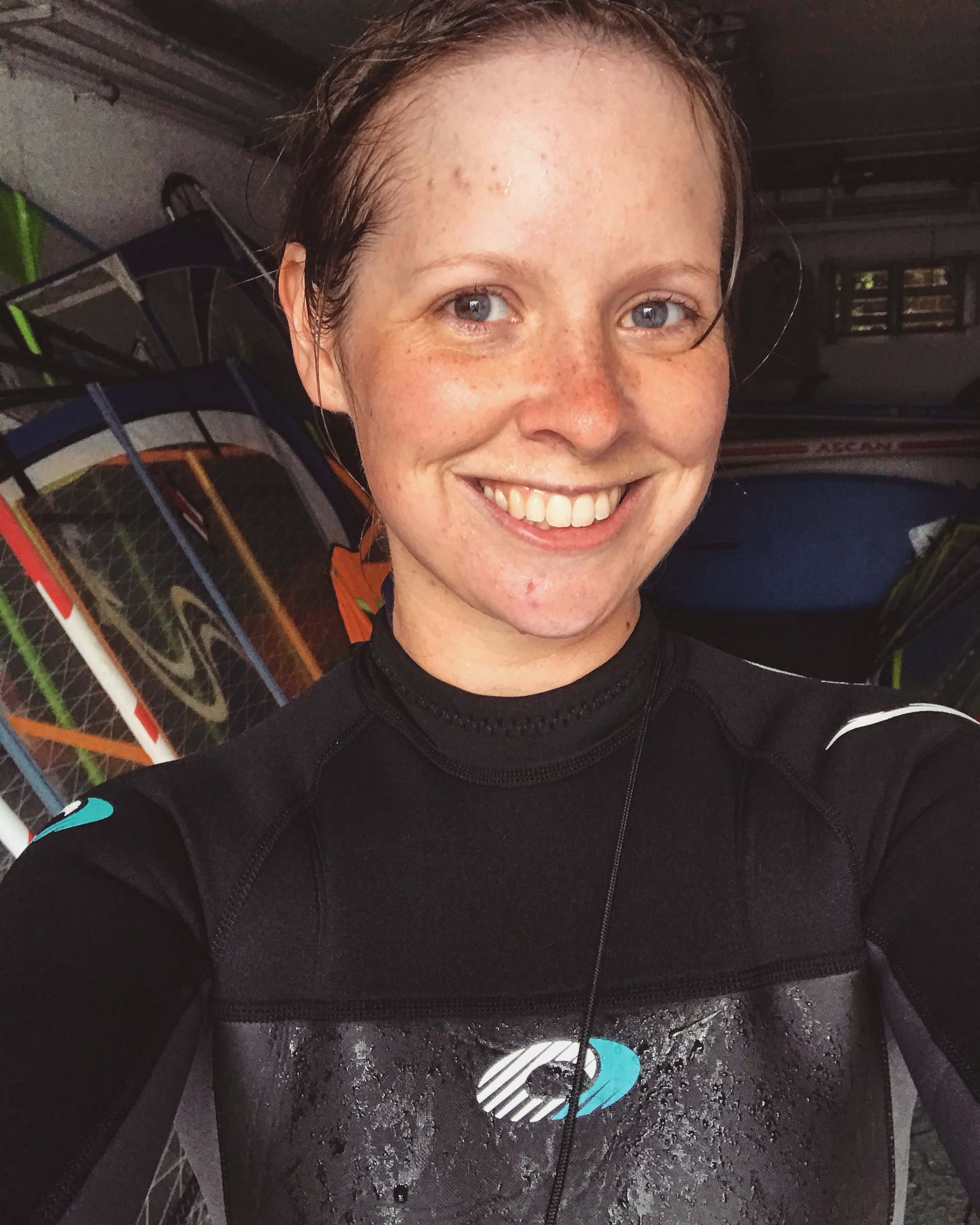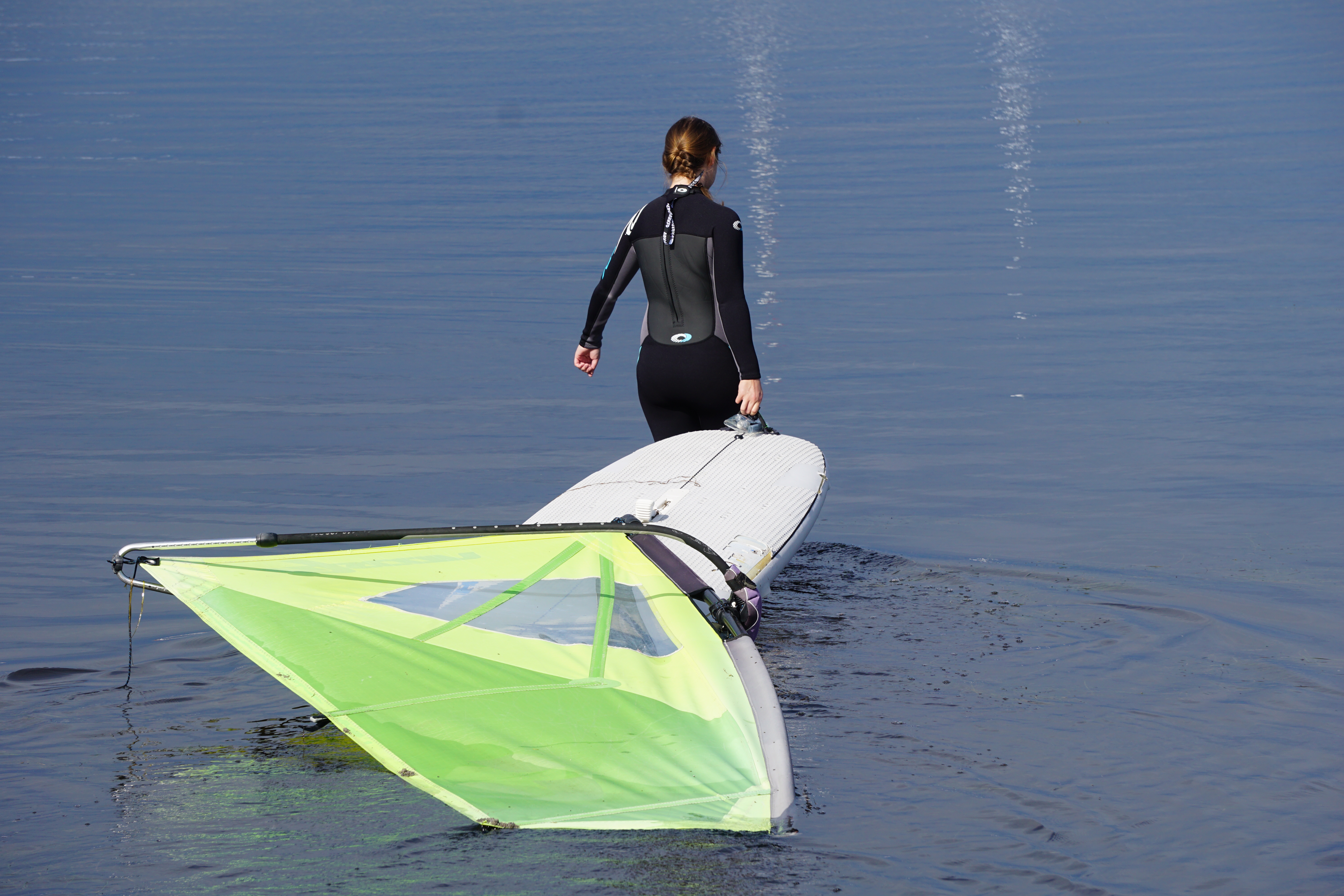Der Mittwochmorgen begrüßte mich dann mit Sturm und Kälte. Windstärke 6, hohe Wellen, starker Regen, das 3.5 – Segel und ich. Die Kombination war gut, so schaffte ich endlich einen Beachstart, der viel angenehmer ist als dieses ständige aufs Brett gekrabbele. Nachmittags war das Wetter weiterhin stürmisch, doch an diesem Tag lernte ich richtig viel und war unheimlich froh, als ich abends unter meiner heißen Dusche stand. Später holte ich noch meine Freundin vom Bahnhof ab und wir machten es uns gemütlich.