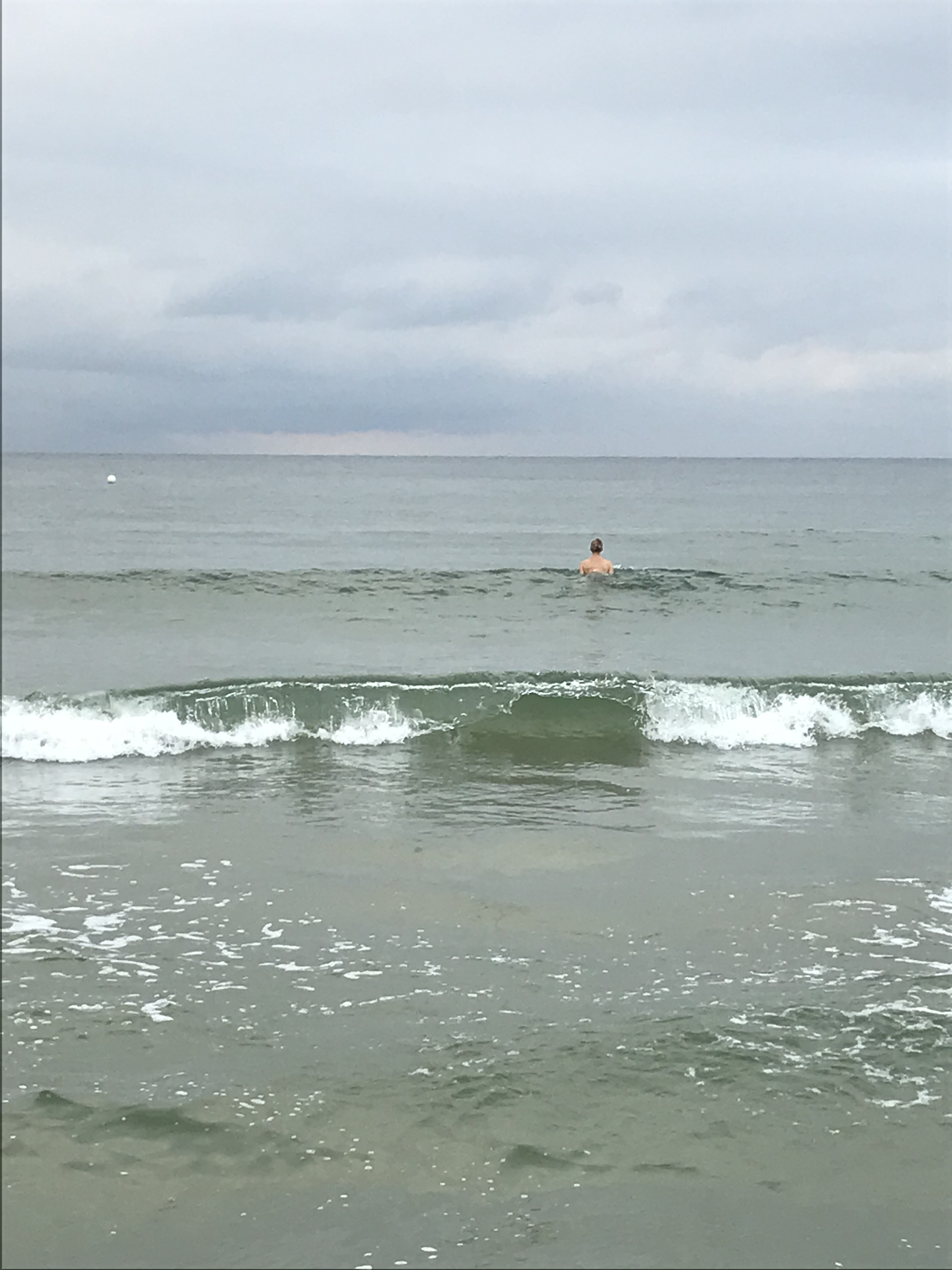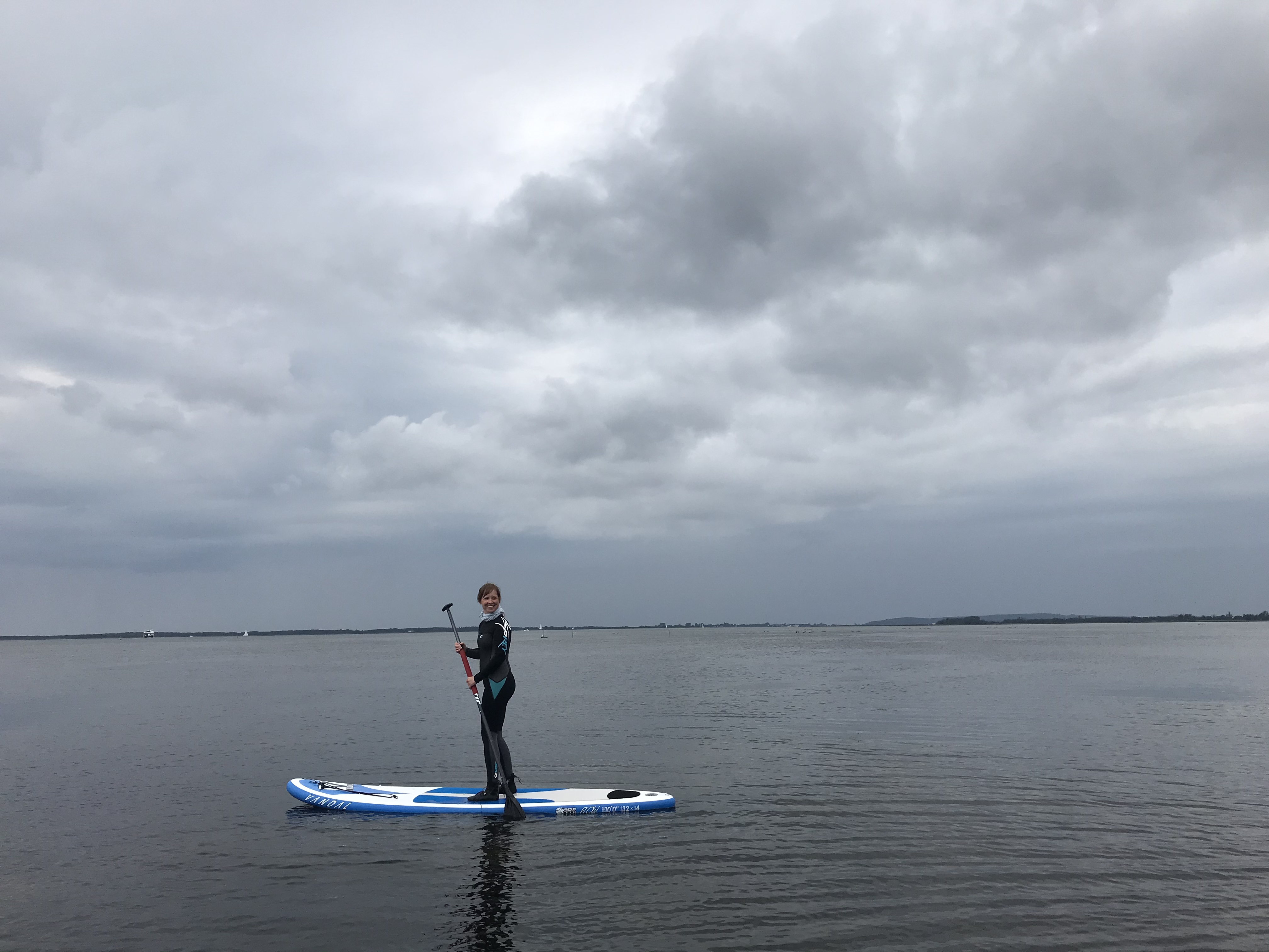 Am surfreien Donnerstag fuhren wir zum Markt nach Thiessow, wo sich gefühlt ganz Rügen aufhielt. Da das Wetter immer noch bescheiden war, wollten wir danach zu einem tollen Café in Alt Reddevitz fahren um einen guten Kaffe und ein fettes Stück Torte zu verzehren, aber dort war ebenso ganz Rügen anwesend. Sie standen sogar meterweit an, im Regen! Wir kehrten also woanders ein und beschlossen, abends noch nach Binz zu fahren um uns dort etwas Suhsi zu gönnen. Das war jedoch ausgebucht und so fuhren wir erst freitags hin. Denn da hatte sich der Sturm verzogen. Morgens konnte ich eine Runde mit großem Segel surfen und hatte viel Spaß, ich fühlte mich richtig gut. Hier, seht alle her, surft Karin auf dem Meer. Ziel erreicht! Nachhmittags sind wir beide dann noch eine Runde SUP gepaddelt und als hätte sie noch nicht genug, springt meine Freundin abends sogar bei Binz in die Wellen. Es war zwar nicht mehr stürmisch, aber dennoch ziemlich frisch. Hut ab!