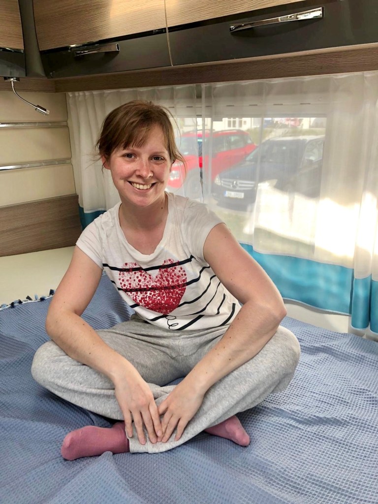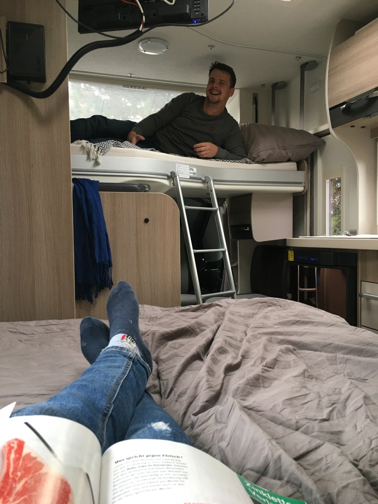 Während einer kocht, kommt der andere also problemlos vorbei, ganz gleich, wie viele Betten belegt sind. Über dem Fahrerhaus ist unheimlich viel Stauraum, den wir aktuell noch gar nicht nutzen! Der Trink- und Abwassertank sowie WC-Kartusche und Gasflasche, alles ist leicht zu bedienen. Unter dem Doppelbett gibt es eine große Garage, die man von außen wie auch von innen super bedienen kann und wo sich unheimlich viel verstauen lässt, das gefällt uns richtig gut.